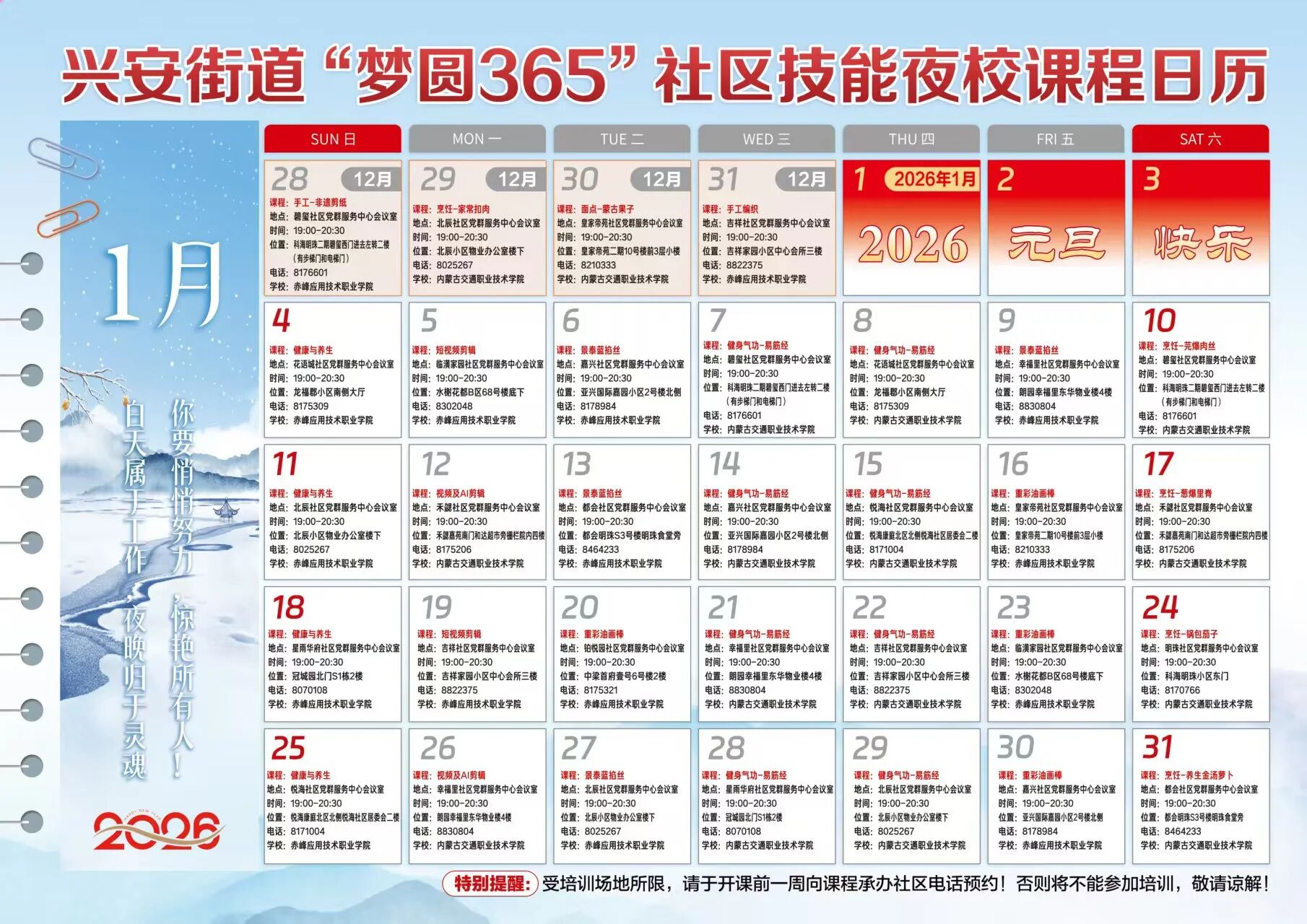 夜幕降临,兴安街道都会社区党群服务中心内灯火通明、暖意融融。20余名居民围坐在一起,正跟随专业老师研习景泰蓝掐丝技艺。作为全市首家社区技能夜校,“梦圆365”自2024年7月启动以来,已形成“全年365天不打烊、每日1个社区轮值开课”的常态化运营格局。翻阅2026年度课程表,景泰蓝掐丝、重彩油画棒、短视频剪辑、中式烹饪等特色课程每晚轮番上演,精准匹配不同群体的学习诉求。