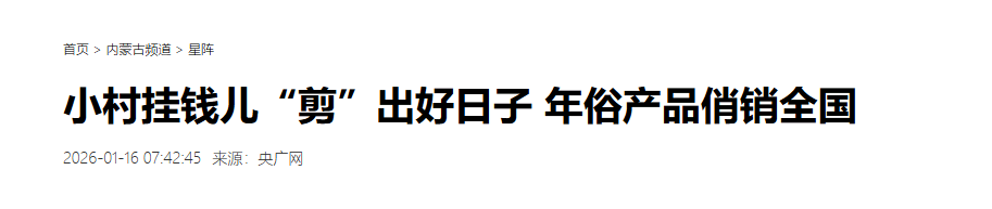 1月16日,央广网刊发了《小村挂钱儿“剪”出好日子 年俗产品俏销全国》一文。