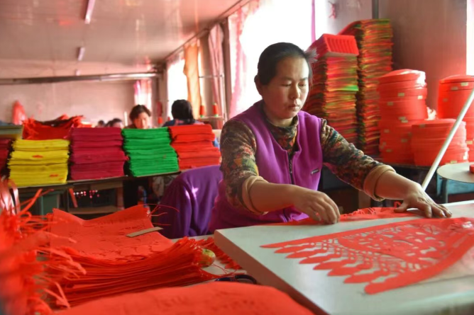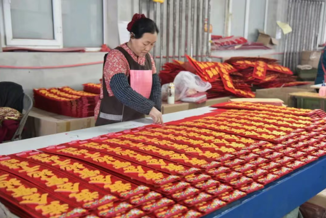 如今,车间里激光裁切机与手工粘贴台配合高效,每天可生产春联300幅、挂钱4000余张,带动50多名本地妇女稳定就业,人均年收入超过2万元,不少人成了手艺熟练的“老师傅”。