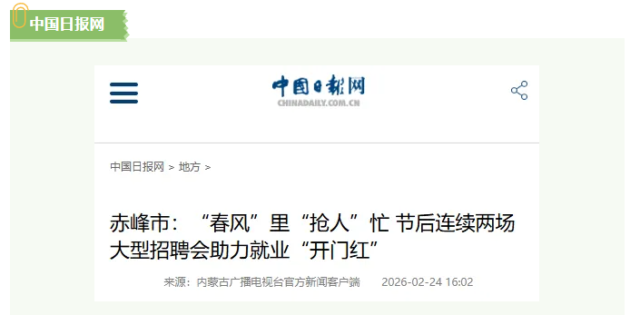 2月24日,中国日报网刊发了《赤峰市:“春风”里“抢人”忙 节后连续两场大型招聘会助力就业“开门红”》一文。