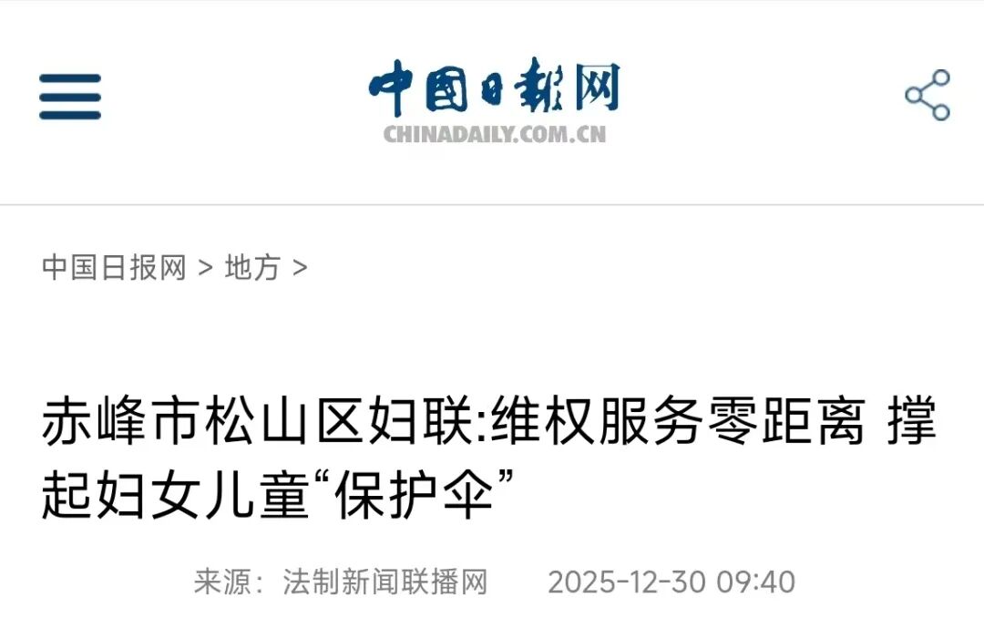 12月30日,中国日报网刊发了《赤峰市松山区妇联:维权服务零距离 撑起妇女儿童“保护伞”》一文。