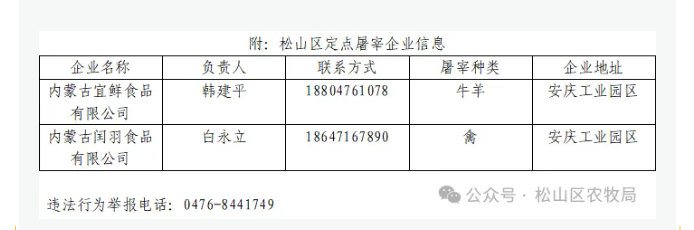 民以食为天,食以安为先。请广大市民朋友进一步提高食品安全意识,经营、购买肉类产品到定点屠宰企业或者超市、正规门店购买,并查看“两证两章”(即:动物产品检疫合格证、肉品品质检验合格证、动物检疫合格验讫印章、肉品品质检验合格验讫印章)。发现私屠滥宰、饲喂“瘦肉精”及生产、经营、运输、贮藏、加工病死动物及动物产品等违法行为,要及时向松山区农牧局进行举报,一经查实将依法从严从重处罚;涉嫌犯罪的,依法移送司法机关追究刑事责任。