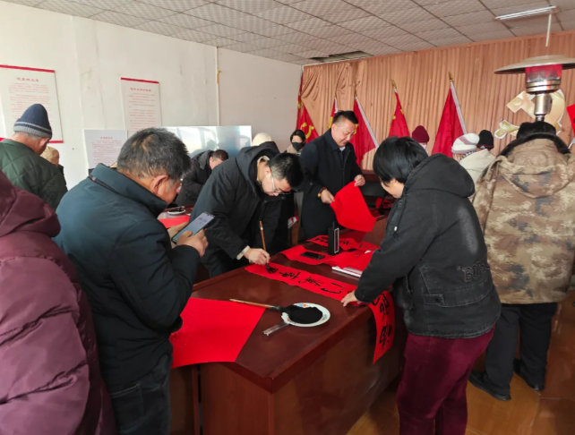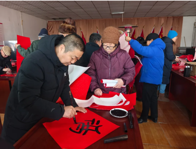 活动现场暖意融融。党员干部亮身份、作表率,将文体器材开箱陈列,并细心讲解锣鼓擦和音响如何使用和保养。这些器材不仅是传承民俗的“文化装备”,更是局党组心系乡村文化振兴的具象表达。在活动室,党员干部与区书法家协会的志愿者们挥毫泼墨,“党建领航兴乡村,文化惠民暖民心”、“春满农家添福祉,福临小院庆丰年”等春联一气呵成,笔墨间既流淌着传统年味儿,更凝聚着对村民的真挚祝福。村民们围聚观赏、争相挑选,接过春联的笑容里满是欢喜,现场欢声笑语不断,党群同心的画面格外温馨。