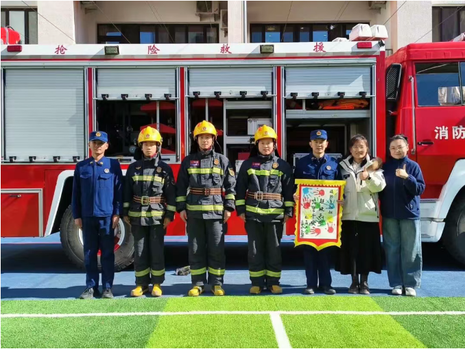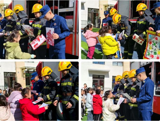指尖凝暖意,非遗敬英雄。活动尾声,孩子们带着精心制作的非遗手工作品,向消防员叔叔们送上最真挚的敬意。一幅幅剪纸,传心意;一条条围巾,送温情;一面锦旗,盛满敬意。这些作品既承载着孩子们对“火焰蓝”的崇拜与感恩,也将传统非遗文化与感恩教育巧妙融合。消防员们接过这份带着温度的礼物,与孩子们亲切合影,让这份跨越年龄的敬意与温暖,定格成春日里最动人的画面。