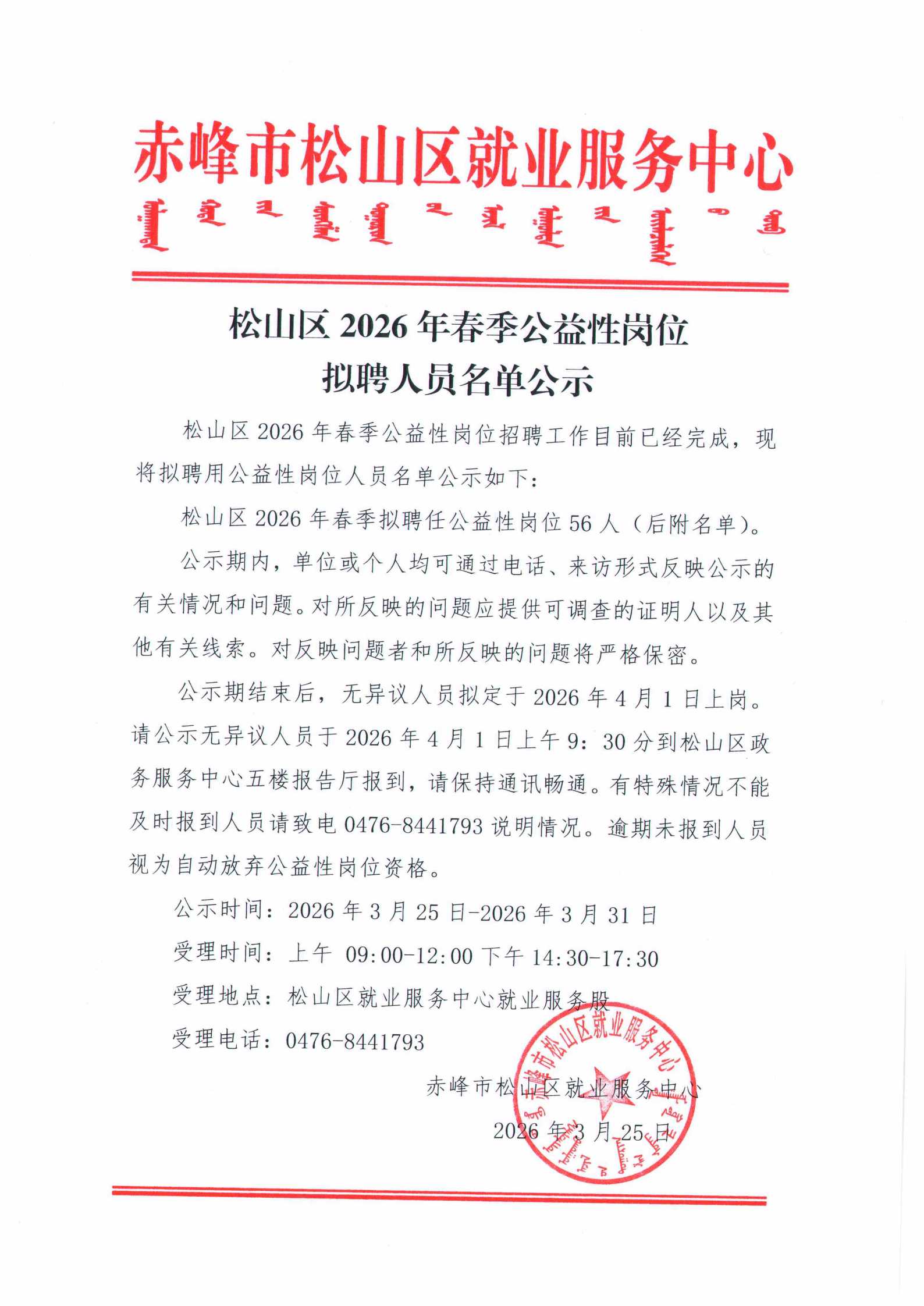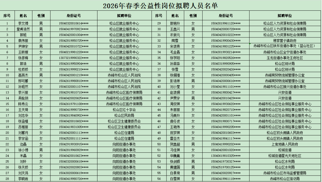 松山区2026年春季公益性岗位拟聘人员名单公示