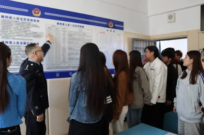 活动伊始,200余名师生走进松山区拘留所,开启了一场特殊的沉浸式法治体验。在管教民警的全程引导下,同学们有序参观了拘区、收拘室等功能区域,近距离观察了拘留所的日常管理模式、执法工作流程与规范化监管要求。高墙内严肃规整的环境、严格规范的管理,让书本上抽象的法律条文变成了触手可及的现实,同学们真切感受到了法律的严肃性与权威性,对“违法必受惩”有了最直观的认知。