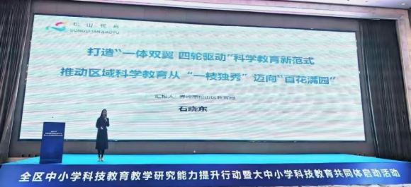 会上,松山区作为全国中小学科学教育实验区,以《打造“一体双翼 四轮驱动”科学教育新范式—推动区域科学教育从“一枝独秀”迈向“百花满园”》为题作典型发言,全面展示了我区科学教育从“点状突破”走向“全域开花”的发展历程,赢得了与会领导和同仁的高度评价.