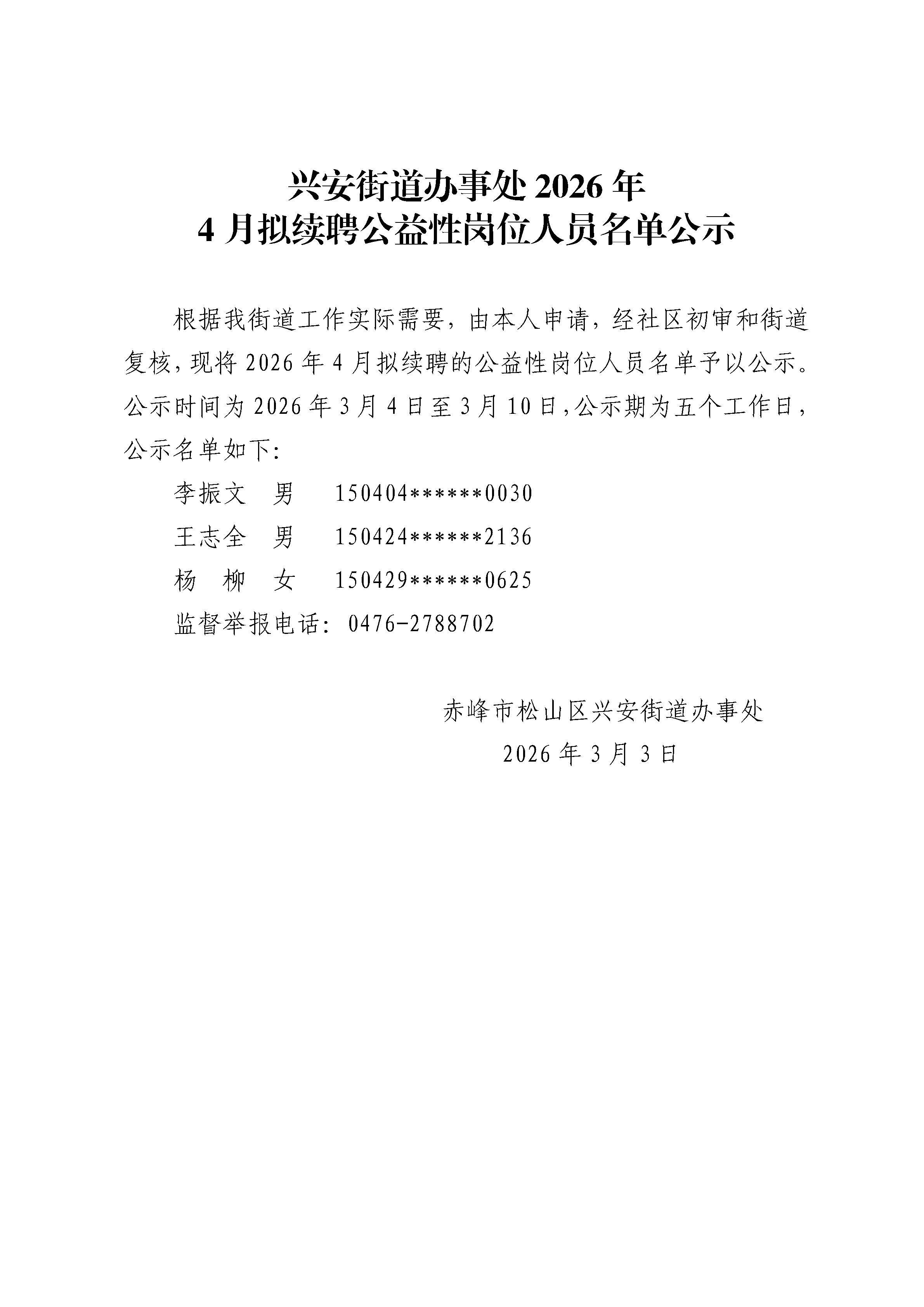 兴安街道办事处2026年4月拟续聘公益性岗位人员名单公示