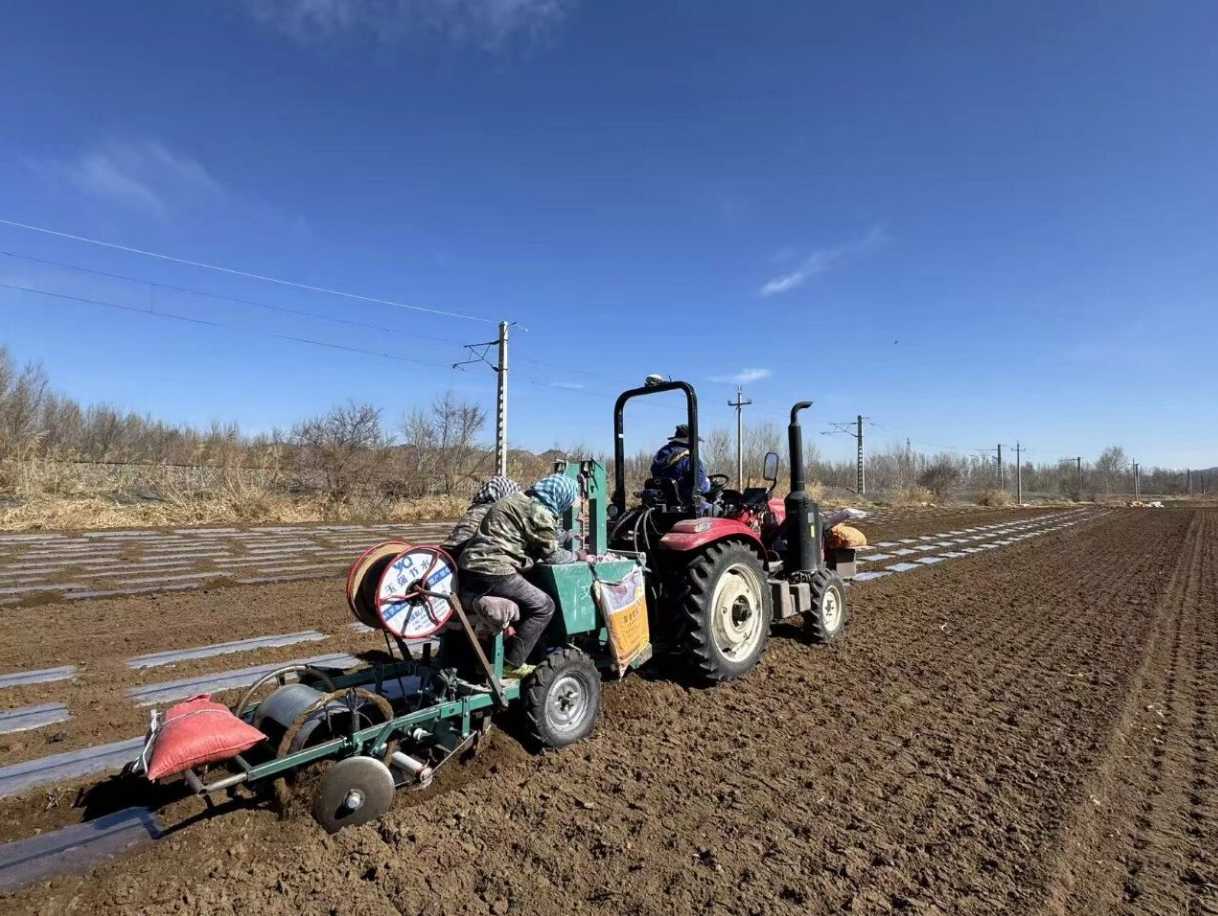 近日,记者走进王府镇敖包村,只见田埂间人工与机械配合默契,呈现出一派热火朝天的劳作景象。一台台播种机在平整的田垄上匀速穿梭,精准且高效地完成开沟、覆膜、播种、覆土等一系列工序。村民们紧跟机械,仔细检查是否有漏播情况并及时补种。