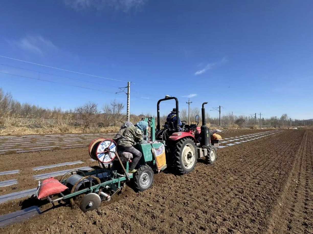近日,记者走进王府镇敖包村,只见田埂间人工与机械配合默契,呈现出一派热火朝天的劳作景象。一台台播种机在平整的田垄上匀速穿梭,精准且高效地完成开沟、覆膜、播种、覆土等一系列工序。村民们紧跟机械,仔细检查是否有漏播情况并及时补种。