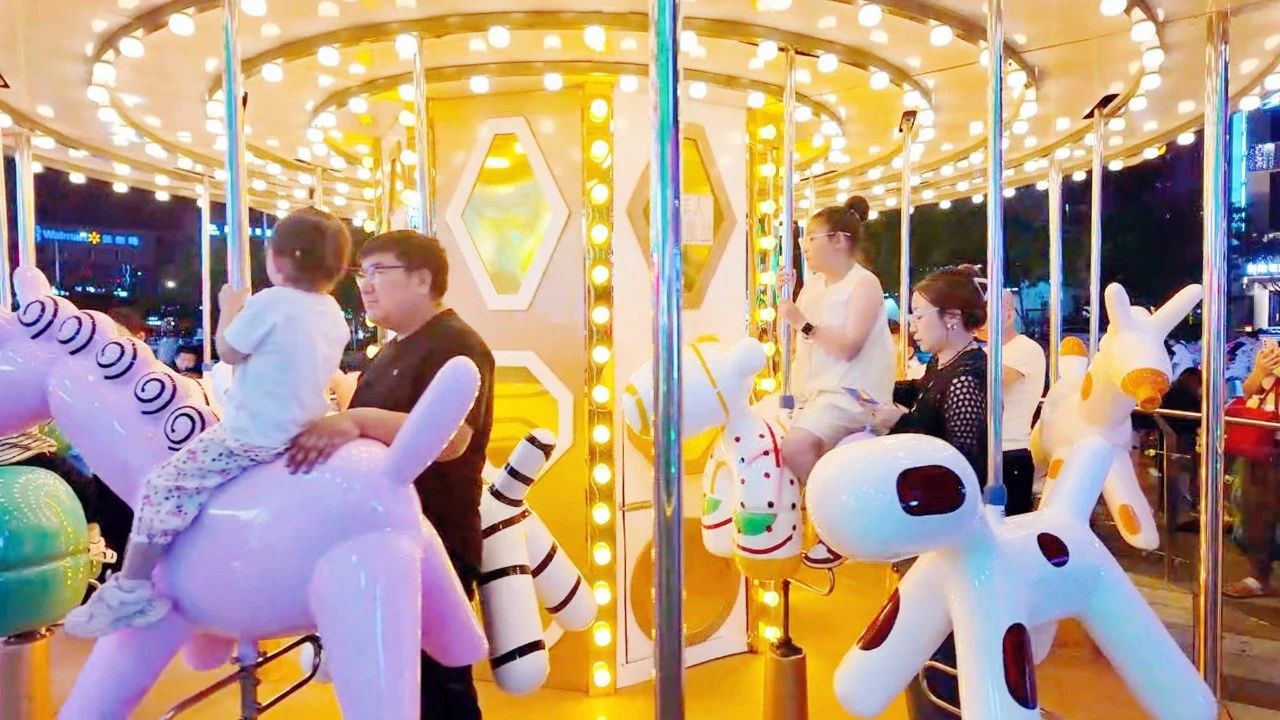 据了解,夜市不仅涵盖“吃喝购”,更设置了儿童娱乐区域,商户投入近200万元引入全新娱乐设施,旋转木马、充气城堡等设备让孩子们“乐不思蜀”。“灯饰天幕太漂亮了,孩子在儿童区玩得不肯走,在这里能吃到锦州的海鲜,以后会经常来。”市民贾美艳说。
