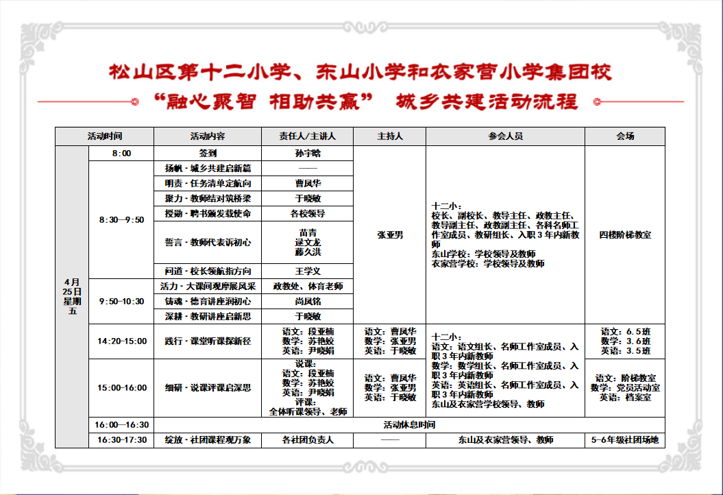 风传花信,雨灌春尘。值此融融春光之际,为了进一步落实《松山区基础教育集团化办学指导意见》和《松山区义务教育阶段“城乡共建促进型”集团化办学实施方案》,推进城乡教育一体化发展,促进校际交流,实现资源共享、文化共建、特色融合、建设互动共赢的教育共同体。4月25日,集团校开展了以“融心聚智 相助共赢”为主题的结对共建活动,深入交流经验,为学校发展贡献智慧。