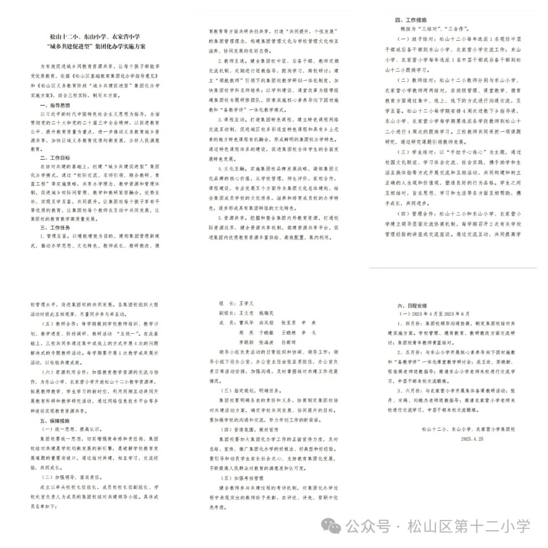 曹凤华副校长宣读松山十二小、东山小学、衣家营小学“城乡共建促进型”集团化办学实施方案。他强调,这一方案旨在通过“校际交流、名师引领、联合教研、青蓝工程”等实施策略,共享办学理念、教学资源和管理体制,促进城乡校际间管理、教学和教研紧密融合,优势互补,实现互学互鉴,共同提升。