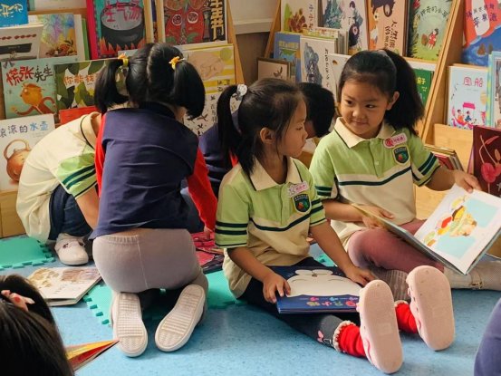 活动开始,中一班的小朋友们在老师和志愿者们的带领下,在园内阅读角挑选自己喜欢的书籍,小朋友们席地而坐津津有味地的阅读着自己喜欢的绘本故事书,时不时地与小伙伴讨论书籍内容,读到有趣的瞬间小朋友们也会和好朋友一起在分享,体验阅读的快乐。
