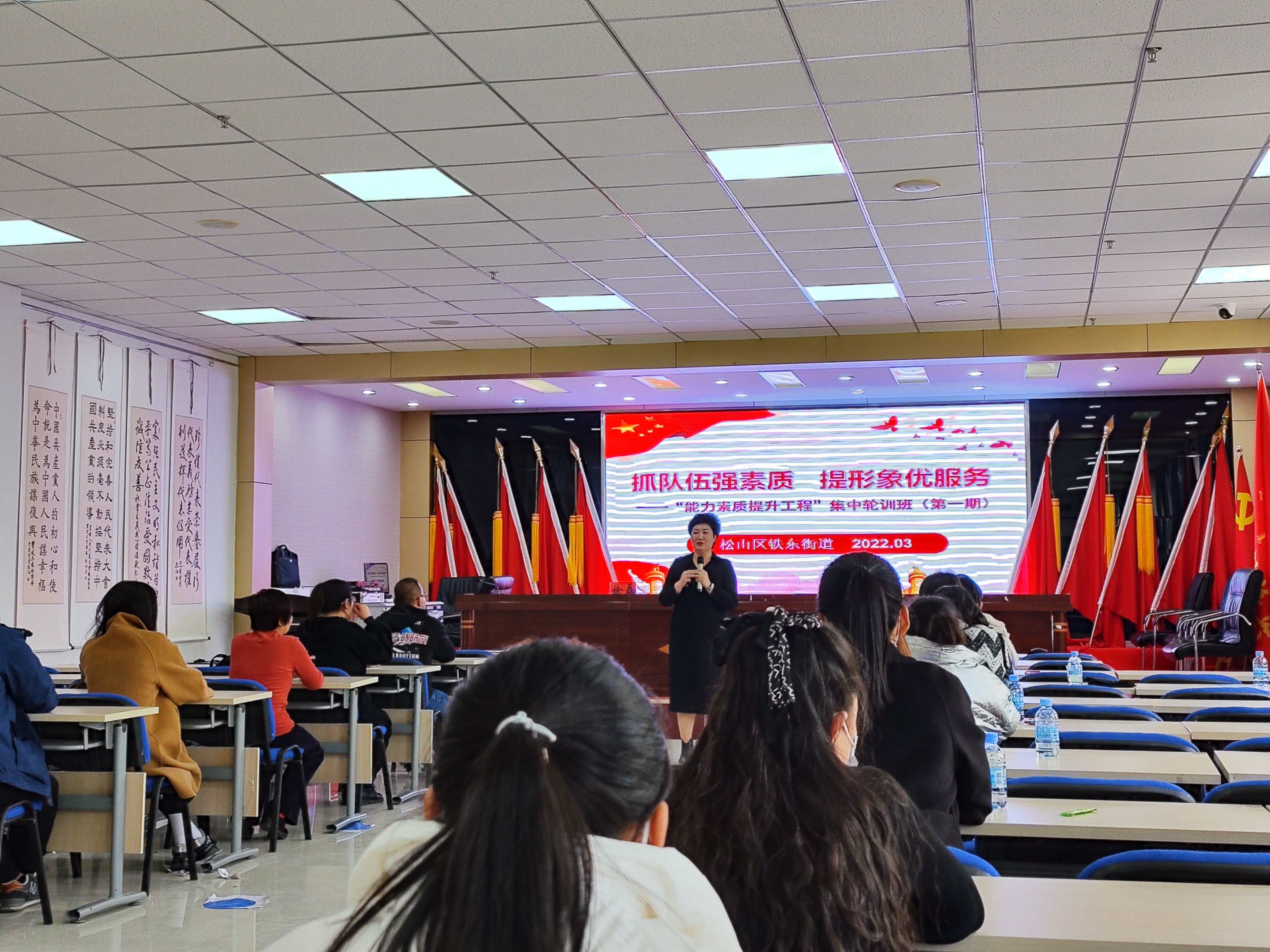 松山区铁东街道为继续深化“放管服”改革,营造良好的营商环境,扎实推进政务服务标准化、规范化建设,进一步增强全街党群服务中心街居干部职工、社会工作者、志愿者的形象和服务意识,提升服务对象的满意度,助力推进全国文明城市创建工作,于3月9日,在丰泽园社区党群服务中心,开展为期2天的“抓队伍强素质 提形象优服务” 能力素质提升工程集中轮训班。街道全体街居干部、街道“五社联动”社会工作站入驻社会组织、社会工作者、志愿者等70余人参加了培训。