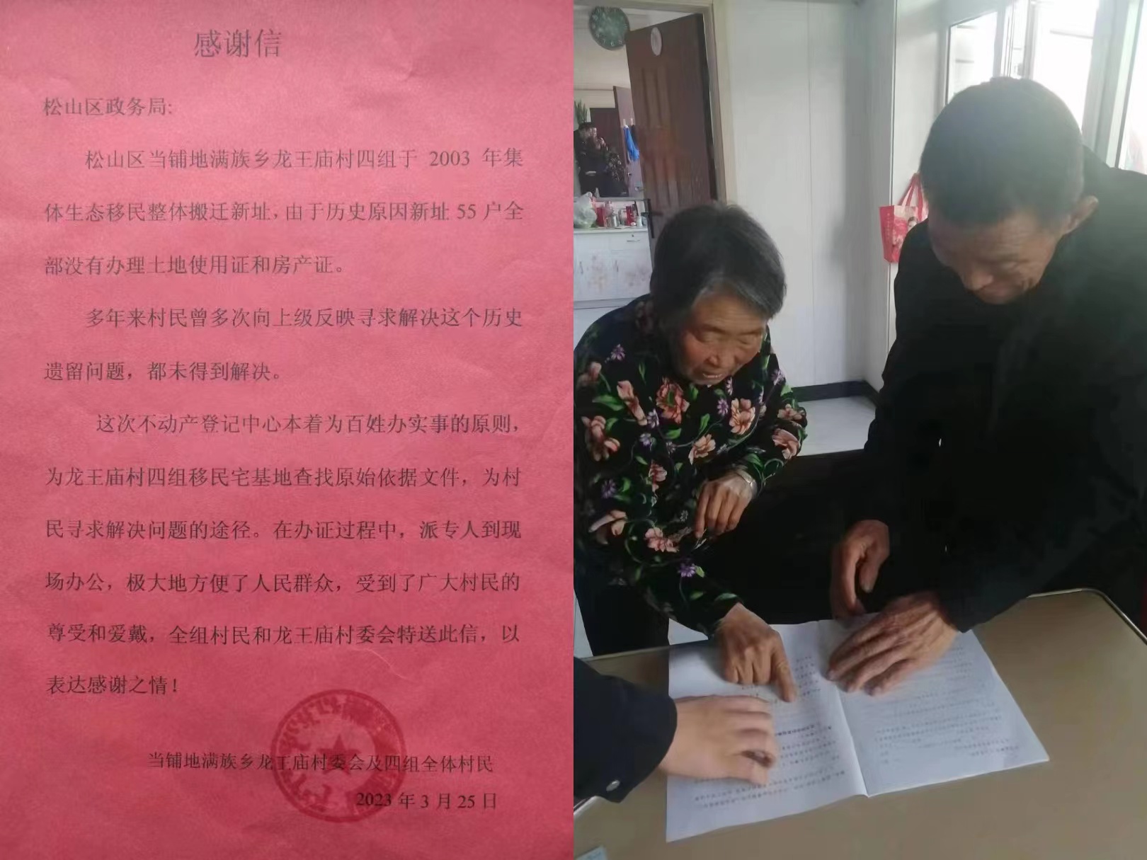 一封感谢信,一份为民情。近日,松山区政务服务局收到一封表扬信,当铺地满族乡龙王庙村委会及四组全体村民表示对松山区政务服务中心区不动产登记窗口的感谢,为他们耐心细致的服务点赞。