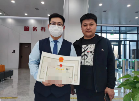 图片:综窗帮办代办专员于斌与园区代办员为郭先生成功办理营业执照
