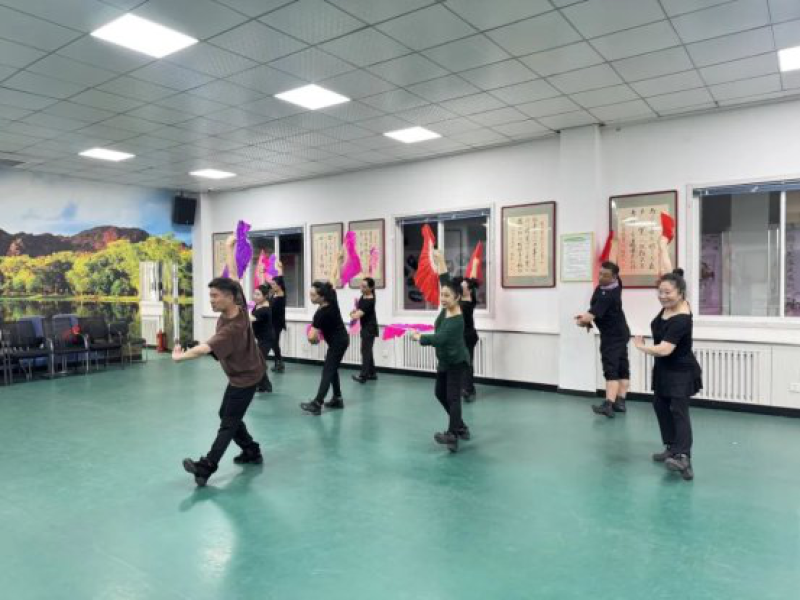 “双手打开,掌心向上,想象自己正在拥抱阳光。”舞蹈老师站在大厅前方,一边用生动的比喻讲解动作要领,一边亲身示范。随后,老师将复杂的舞蹈动作拆解成一个个简单的单元,从脚步的进退、身体的旋转到手臂的舒展,都进行了细致入微的教学。面对居民们的疑惑,老师们穿梭在人群中,一对一耐心指导:“阿姨,您的脚步可以再抬高一点,膝盖放松些”“这位叔叔,手的位置这样调整会更标准哦”。