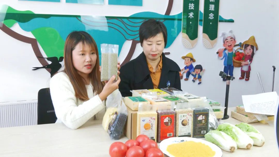 在当铺地满族乡为农服务“新农人”直播间内,乡“三位一体”平台的两名工作人员正面对镜头声情并茂地介绍当地特色农产品,他们面前摆放着各种蔬菜瓜果和杂粮杂豆,品类多样,包装精美。