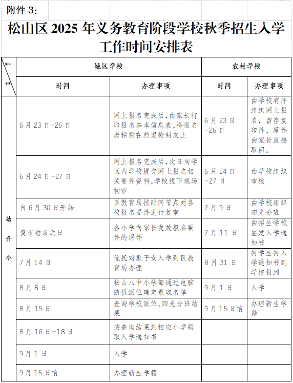 为了便于适龄儿童少年及其父母或其他法定监护人尽快熟知今年招生入学的既定时间节点和所需办理事项,松山区教育局梳理了“幼升小”“小升初”招生入学各环节具体时间表,详见“松山区2025年义务教育阶段城区学校秋季招生入学工作时间安排表”(附件3)。