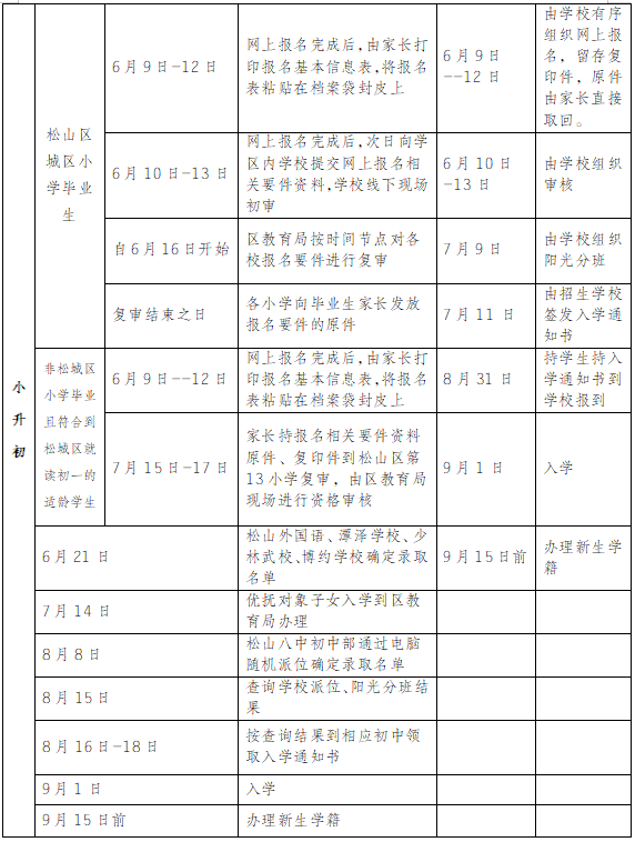 (1)所有非松山区城区小学毕业且符合到松山区城区就读初一的适龄学生于6月9日至12日期间进行网上报名,务必于6月13日前完成网上报名(家长打印报名表,将报名表粘贴在档案袋封皮上),6月13日系统关闭,不再办理网报业务。