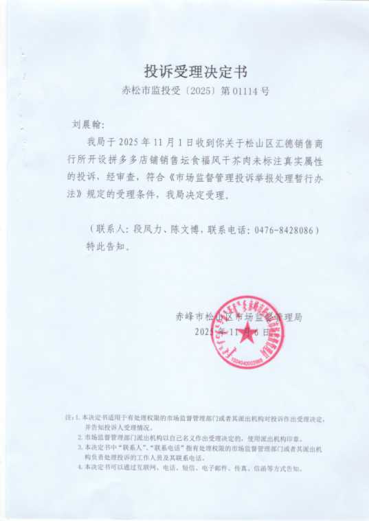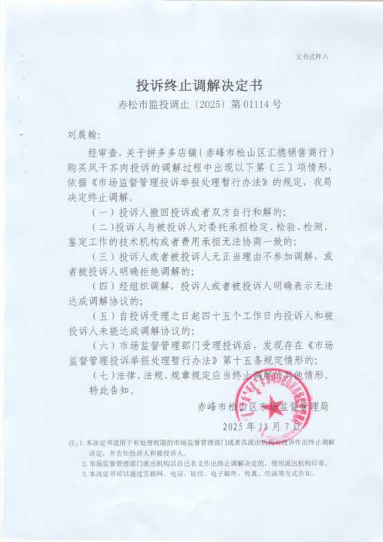请你自本公告发布之日起三十日内到本局领取《投诉受理决定书》(赤松市监投受〔2025〕第 01114号)、《举报不予立案告知书》(赤松市监举报不立〔2025〕第01114号)《投诉终止调解决定书》(赤松市监投调止〔2025〕第01114号),逾期不领取即视为送达。