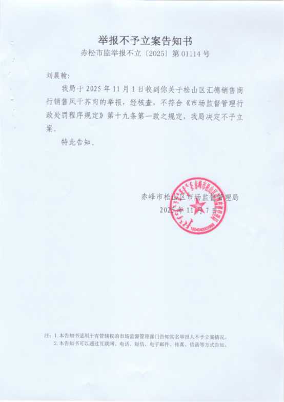 对于你的投诉举报本局于2025年11月6日依法作出的《投诉受理决定书》、2025年11月7日作出《举报不予立案告知书》、《投诉终止调解决定书》,因你提供的联系方式无法接通,邮寄的信件被拒收,本局采取其他送达方式无法送达,依据《市场监督管理投诉举报处理暂行办法》第十四条、第三十一条第二款的规定,本局决定依法向你公告送达《举报不予立案告知书》、《投诉受理决定书》《投诉终止调解决定书》,内容如下: