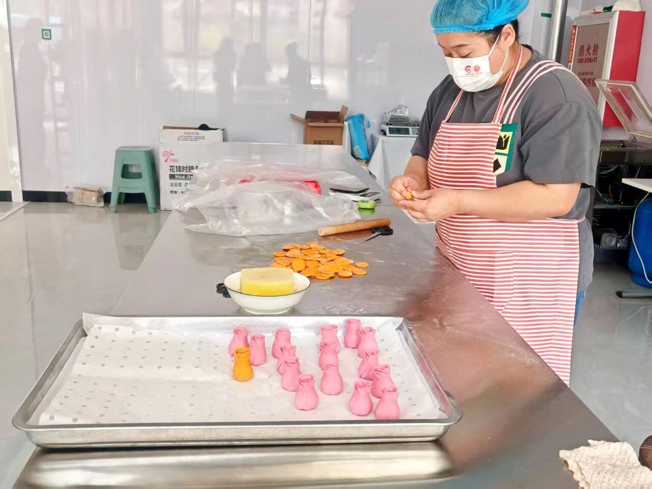松山区兴安街道悦海社区居民孙晓楠正在做面点。