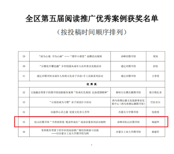 近日,在内蒙古自治区图书馆学会开展的“引领阅读新风尚·昂扬奋进新征程”全区阅读推广评选活动中,松山区图书馆开展的“书香润青苗·阅读伴成长”阅读启蒙系列活动案例荣获全区第五届阅读推广优秀奖!