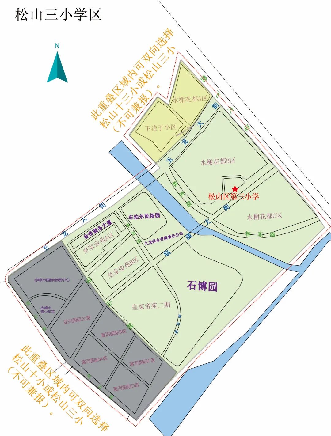 3.松山三小招生区域:(1)宝山路以东,玉龙大街中段以南,铁路线以西,锡泊河以北。(2)玉龙大街中段以南,锦山路南段以东、宝山路南段以西、锡泊河中段以北。注:此区域内含亚兴国际公寓,富和国际B区、C区、A区、D区可双向选择去松山三小或松山十小(不可兼报)。(3)水榭花都A区和下洼子小区可双向选择去松山三小或松山十三小(不可兼报)。