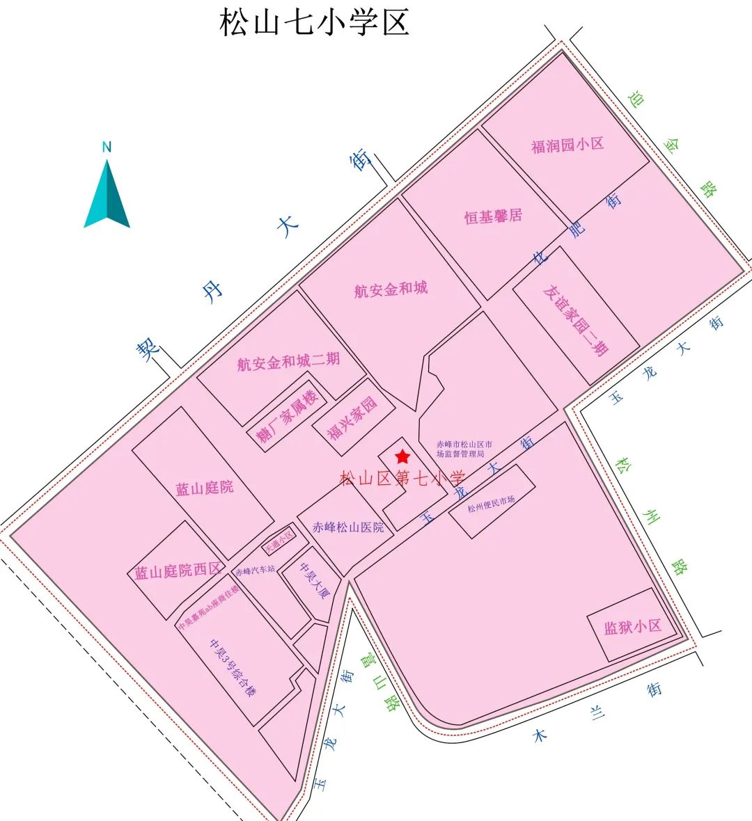 7.松山七小招生区域:铁路线以东,契丹大街西段以南,英金路以西,玉龙大街中段以北。松州路中段以西,木兰街西段经富山路到玉龙大街中段以北。