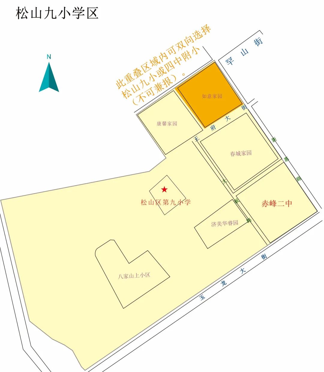 9.松山九小招生区域:(1)西外环路以东,王府大街西段以南、新惠路中段以西、玉龙大街西段以北。(2)康馨家园小区。(3)如意家园可双向选择松山九小或四中附小(不可兼报)。