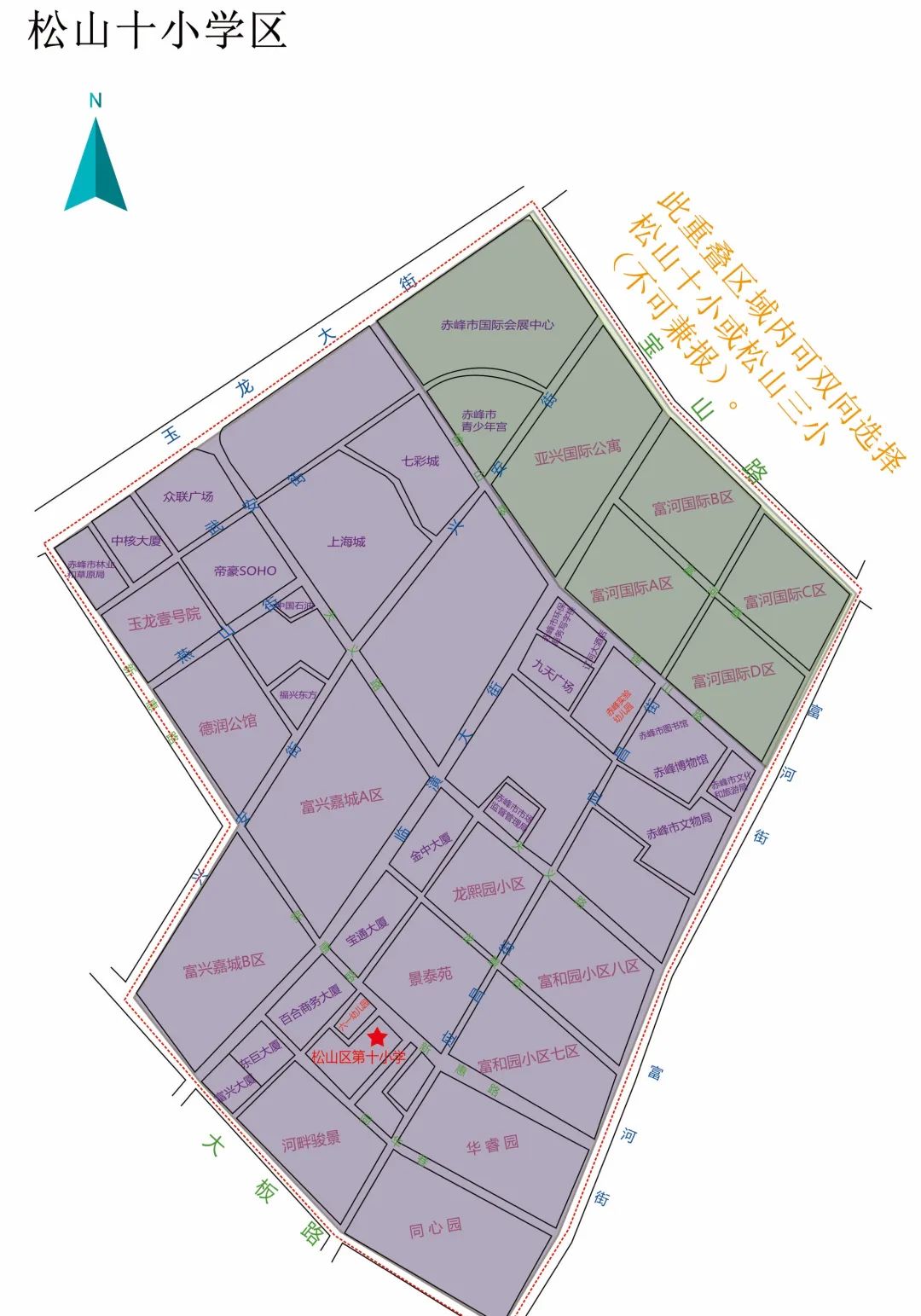 10.松山十小招生区域:(1)大板路南段以东,兴安街以南,新惠路中段以东,玉龙大街西段以南,锦山路南段以西,富河街以北。(2)玉龙大街西段以南,锦山路南段以东、宝山路南段以西、锡泊河中段以北。注:此区域内含亚兴国际公寓,富和国际B区、C区、A区、D区可双向选择松山十小或松山三小(不可兼报)。