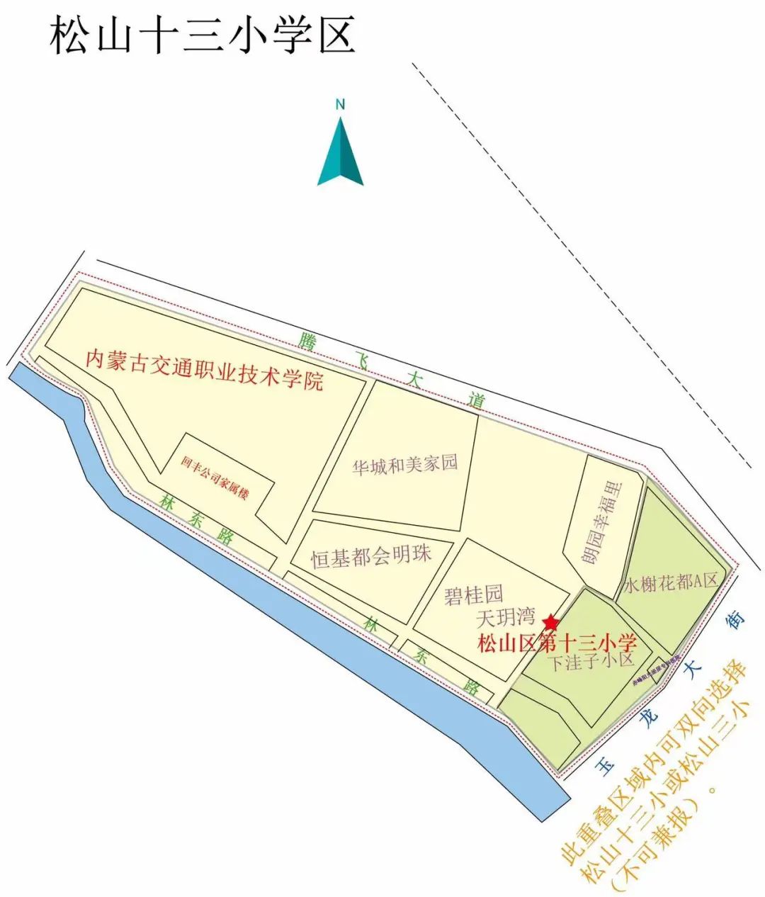13.松山十三小招生区域:(1)林东路以东,王府大街东段以南,腾飞大道以西,玉龙大街中段以北。(2)水榭花都A区和下洼子小区可双向选择松山十三小或松山三小(不可兼报)。(3)回丰公司家属楼。