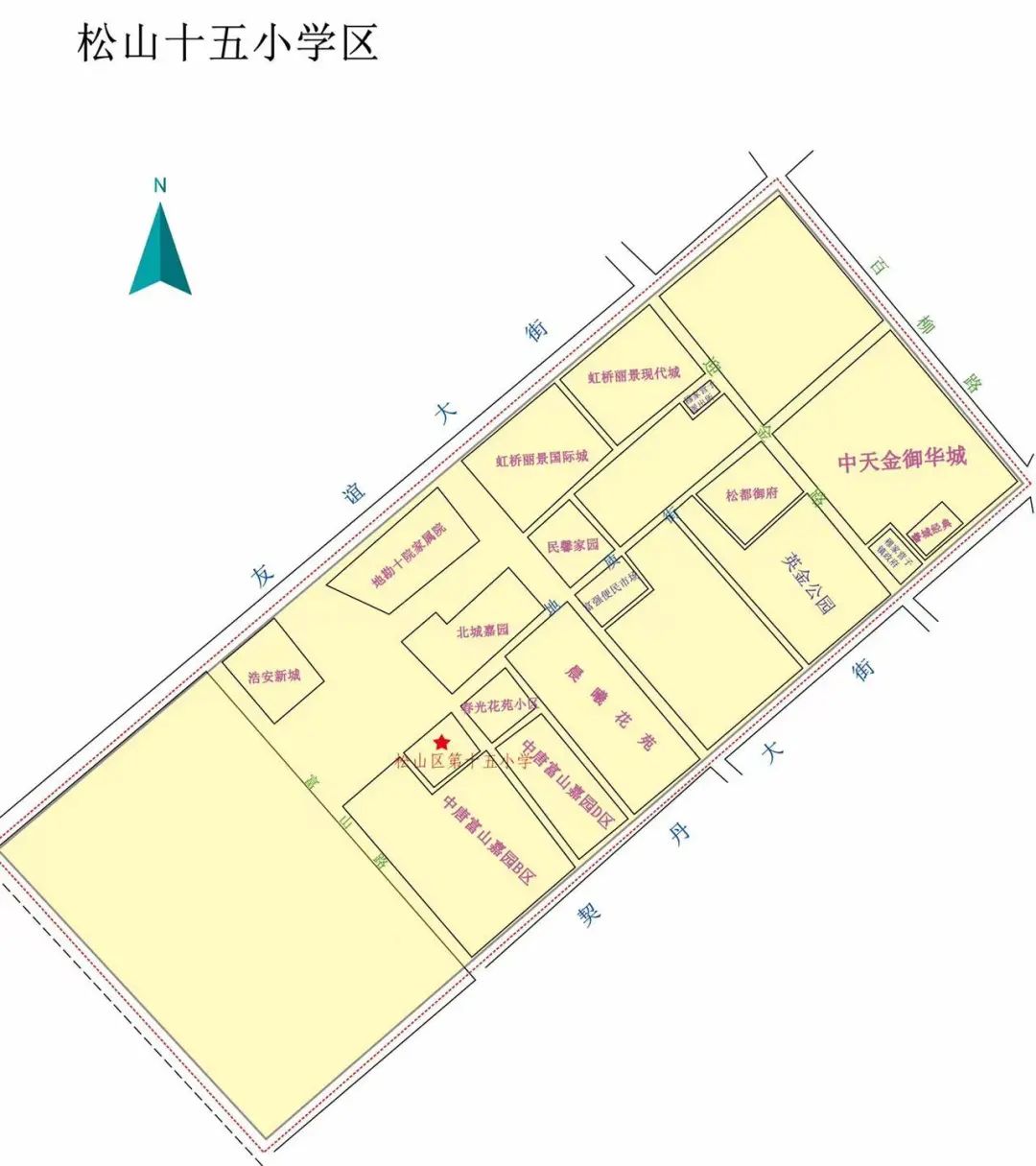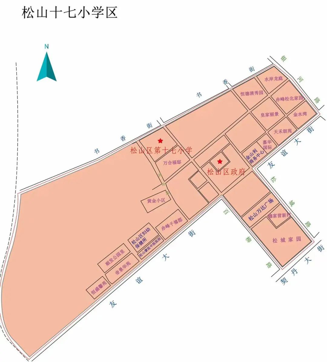 15.松山十七小招生区域:(1)铁路线以东,书香街以南,银河路以西,友谊大街中段以北。(2)松城家园、穆家营新村。