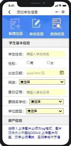 (3)填写报名信息:进入学生信息填写界面,严格按照要求填写真实信息并上传相关图片,填写完毕点击“提交”按钮。