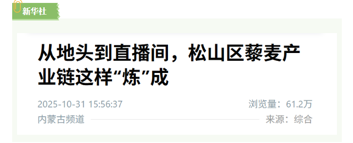 近日,新华社刊发了《从地头到直播间,松山区藜麦产业链这样“炼”成》一文。