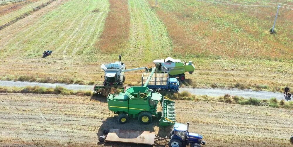 在哈拉道口镇的4000亩藜麦基地里,三台大型联合收割机同时作业。机器驶过,色彩斑斓的藜麦穗被整齐收割、脱粒、装车。“一台机器一天能收900亩左右,效率高、损耗少。”松山区惠农服务农民专业合作社理事长靳学军说。